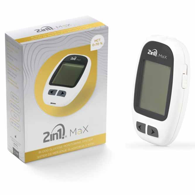 2in1. MaX merilec krvne glukoze predstavlja inovativen ter napreden merilnik krvnega sladkorja, ki je opremljen s posamično pakiranimi testnimi lističi.