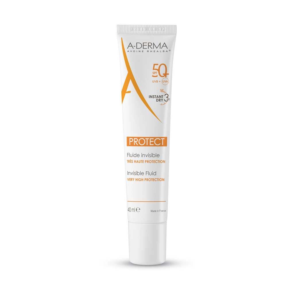 A-Derma Protect nevidni fluid SPF50+ zelo visoka zaščitita pred UVB- in UVA-žarki. Nelepljiva. Vodoodporna. Ne pušča belih sledi. Za mešano do mastno kožo. Za obraz. Za odrasle. Brez parabenov. Nežno odišavljeno.