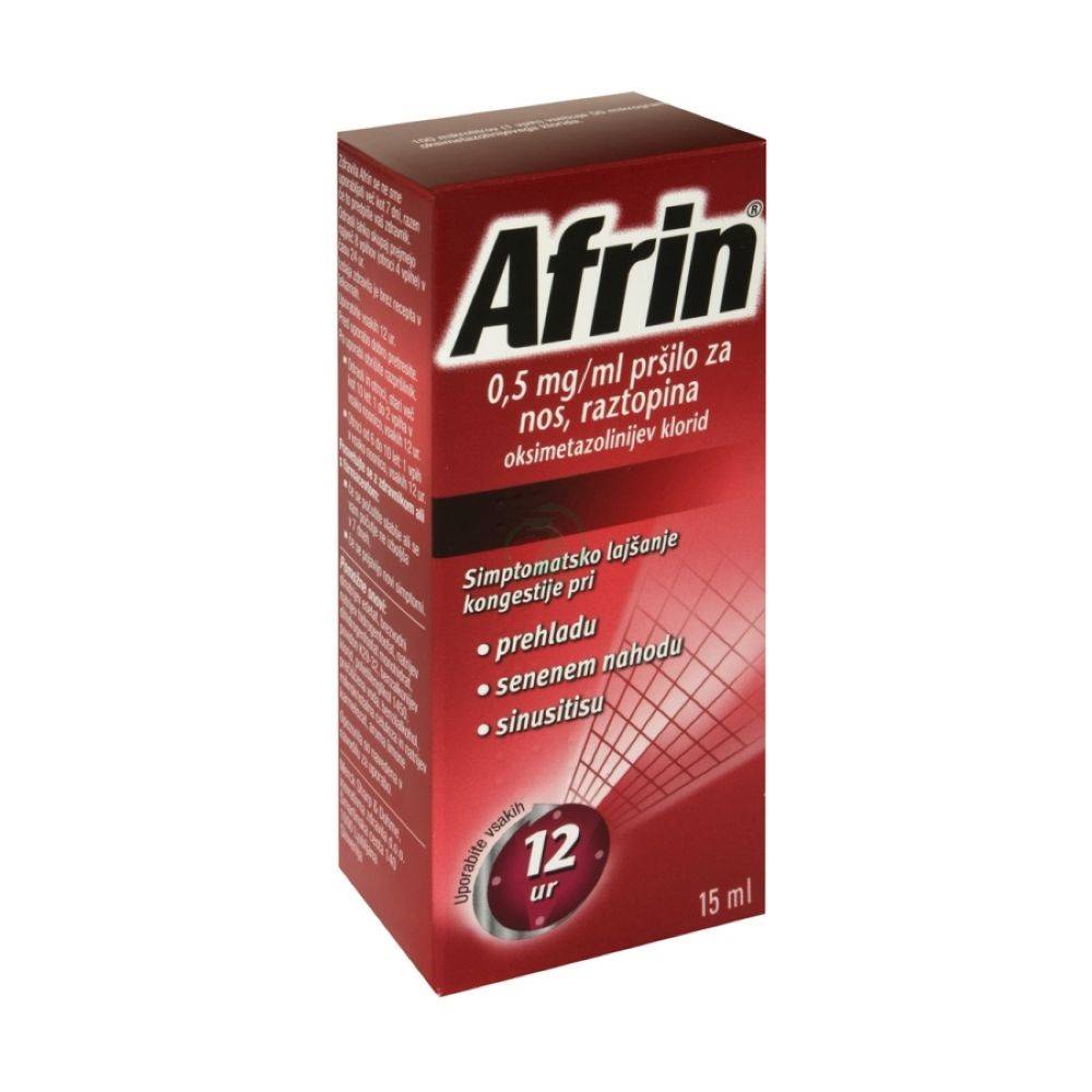 Zdravilo Afrin 0,5 mg ml pršilo je namenjeno učinkovitemu in hitremu lajšanju simptomov zamašenega nosu (to je posledica odebeljene nosne sluznice) ter lajšanju simptomov senenega prehlada ali sinusnega obolenja. Zdravilo Afrin se uporablja na vsakih 12 ur. Prepogosta uporaba lahko poškodduje žile v nosni sluznici.