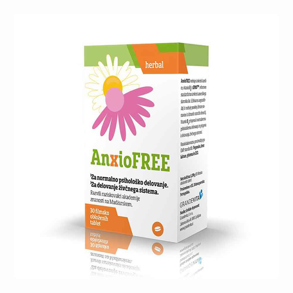 AnxioFREE je prehransko dopolnilo v obliki tablet. Odlična izbira za vse, ki bi želeli vplivati na psihološko delovanje in delovanje živčnega sistema. Vsebuje rastlinske izvlečke in vitamin B6.