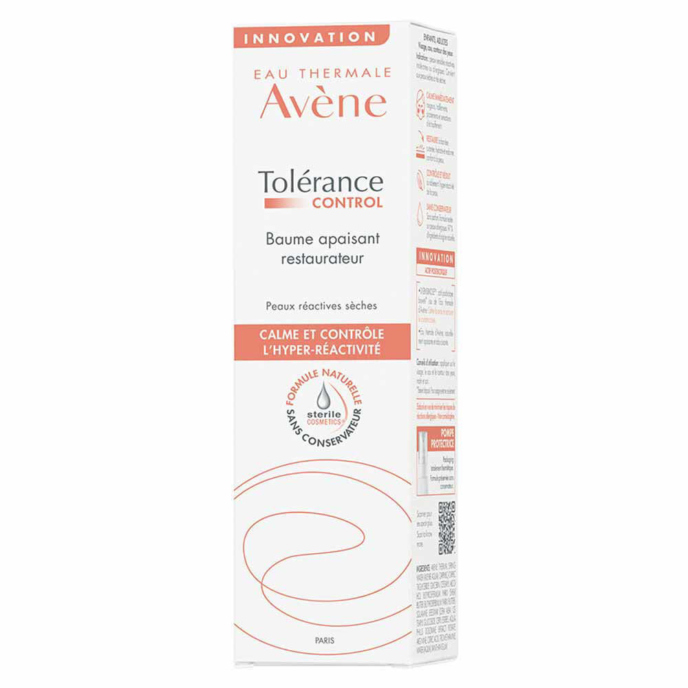 Eau Thermale Avene Tolerance CONTROL Pomirjujoči balzam za obnovo je namenjen negi preobčutljive, reaktivne in k alergijam nagnejene kože. Kožo pomiri v 30 sekundah ter dolgoročno nadzoruje in zmanjšuje hiperreaktivnost kože. Balzam nudi zelo dobro kožno in očesno toleranco. Primeren je za otroke od 2. leta dalje ter je brez dišav in konzervansov.