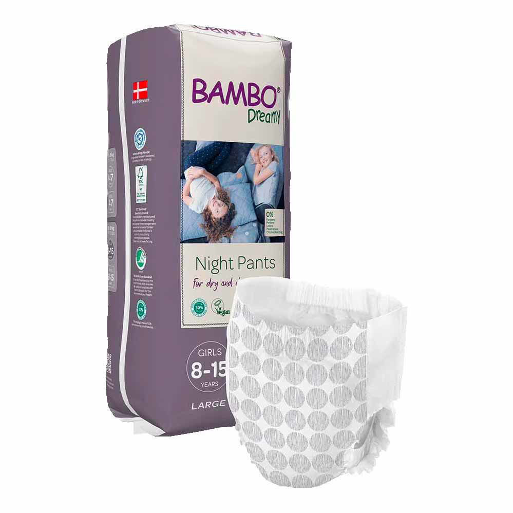 Bambo Nature nočne hlačke so oblikovane tako, da preprečujejo puščanje med spanjem, kar pomaga ohranjati posteljo suho in čisto. Bambo Nature nočne hlačke za otroke so posebej zasnovane za nočno uporabo pri otrocih, ki imajo že nekaj večje potrebe po absorpciji. Na voljo so v različnih velikostih, da ustrezajo potrebam otroka glede na starost, težo, spol in velikost. Te hlačke so priljubljena izbira med starši, ki želijo nuditi svojim otrokom udobno in zanesljivo zaščito med spanjem, obenem pa ohranjati okoljsko ozaveščenost.