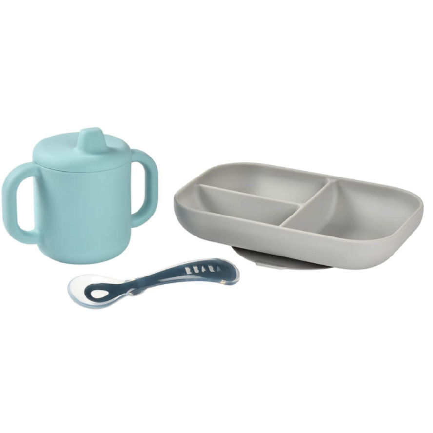 Béaba silikonski jedilni set za malčke vsebuje krožnik, skodelico za učenje samostojnega pitja s pokrovom ter žličko. Vsi deli seta so izdelani iz mehkega, prilagodljivega in varnega silikonskega materiala, ki ne vsebuje BPA ali drugih škodljivih snovi. Silikon je odporen na visoke in nizke temperature ter enostaven za čiščenje. Pripomočki so oblikovani tako, da ustrezajo malčkovim rokam in ustim, kar olajša njihovo uporabo in spodbuja samostojno hranjenje. Béaba silikonski jedilni set za malčke vsebuje vse potrebne pripomočke za hranjenje otroka, kar olajša pripravo in serviranje obrokov.