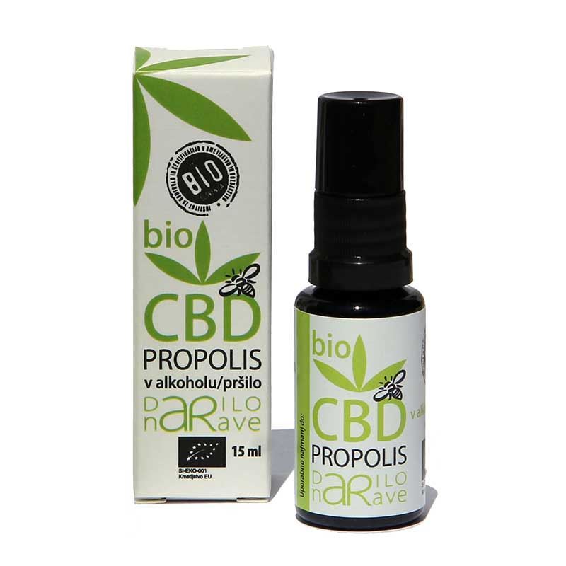 150 mg bio CBD in 15 % propolisa raztopljenega v alkoholu oziroma brez alkohola.