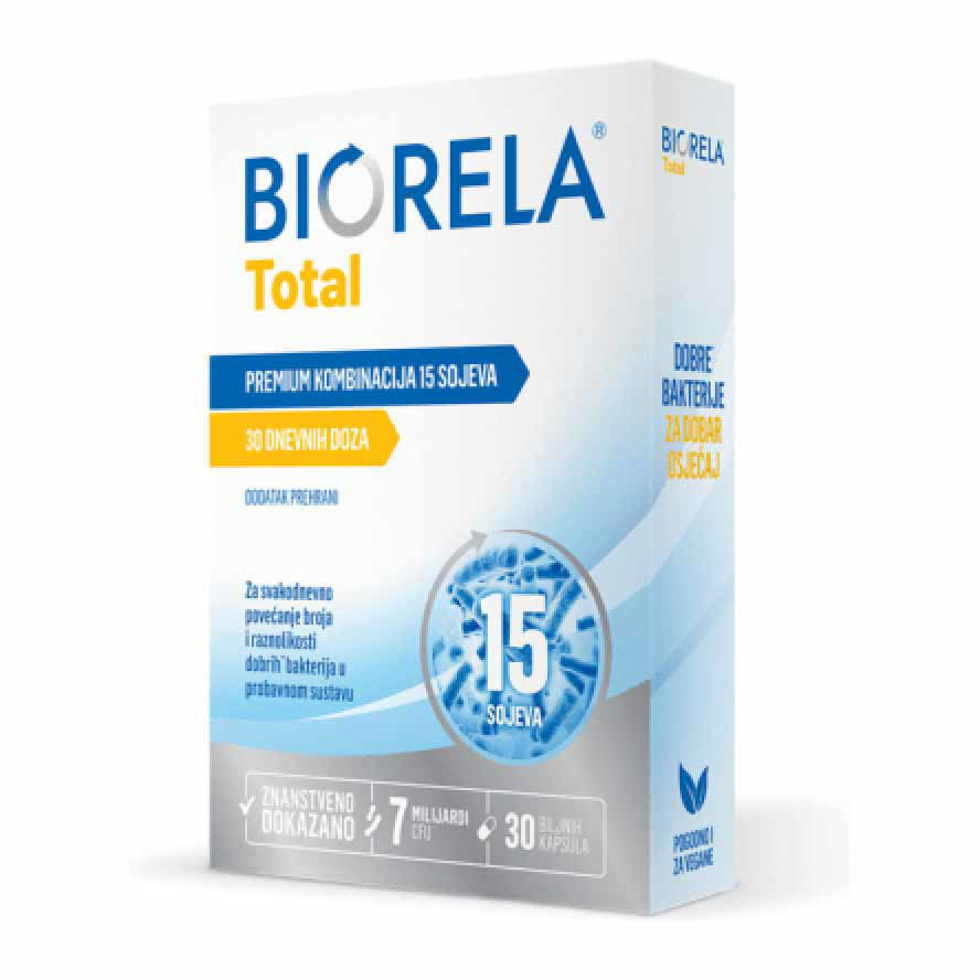 Številni dejavniki, kot so stres, neustrezna prehrana, jemanje antibiotikov in drugih zdravil ali starost, lahko negativno vplivajo na število dobrih bakterij v črevesju in pojav obolenj. Ko se to zgodi, je koristno kot podporo izbrati koncentriran vir vrhunskih sevov dobrih bakterij. Biorela Total je odlična izbira za vsak dan, saj je edinstvena formulacija primerna za odrasle in otroke od 3. leta starosti. Proizvodnja izdelkov Biorela poteka v čistih farmacevtskih prostorih po najvišjih standardih kakovosti.