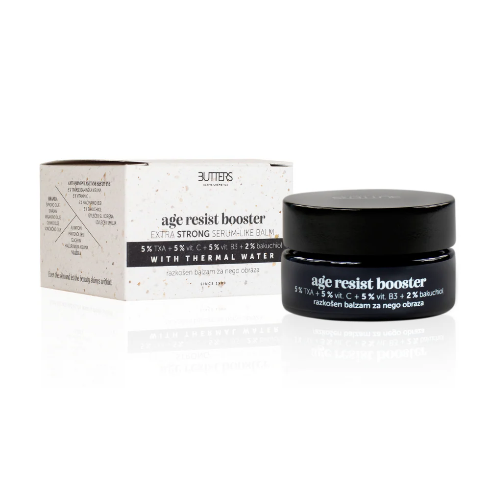 Butters Age Resist Booster razkošen balzam za nego obraza je namenjen izboljšanju in enakomernemu tenu kože ter zmanjševanju hiperpigmentacije in nepravilnosti. Formula vsebuje visoke koncentracije ključnih sestavin: 5% traneksamične kisline, 5% vitamina C, 5% niacinamida, 2% bakuciola, izvlečke sladkega korena in immortelle, ki skupaj zagotavljajo antioksidativno delovanje, zaščito, globinsko vlaženje ter izboljšano strukturo kože.