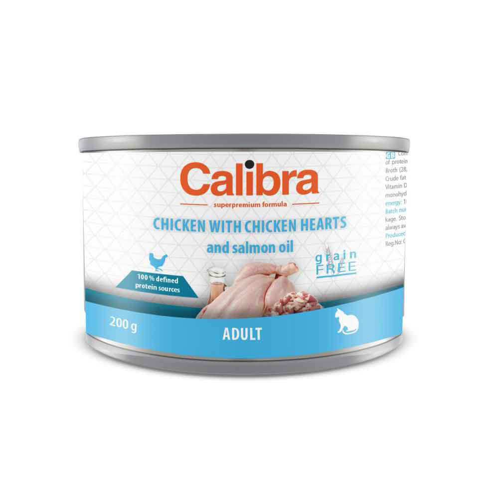 Hrana Calibra konzerva Adult ali Kitten, piščanec in piščančji srčki se ponaša z visokim deležem svežega mesa, kar prispeva tudi k visoki vsebnosti beljakovin. Prav tako pa je ta hrana enostavno prebavljiva, saj ne vsebuje žitaric. V konzervo je dodan tavrin, ki je za mačke izjemno pomemben. Za njihovo kožo in dlako pa bo poskrbelo lososovo olje.
