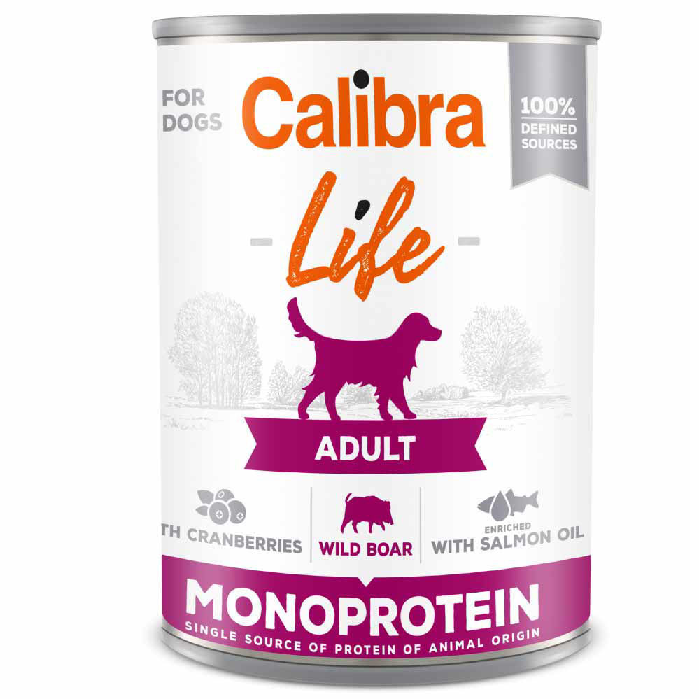 Calibra Life Adult konzerva - divji prašič z brusnicami je visokokakovosten izdelek, ustvarjen za odrasle pse. Izdelek ne vsebuje umetnih arom, barvil, dodatkov in GSO in je sestavljen le iz najčistejših sestavin, kot so meso divje svinje, prave brusnice, lososovo olje in grahova moka.