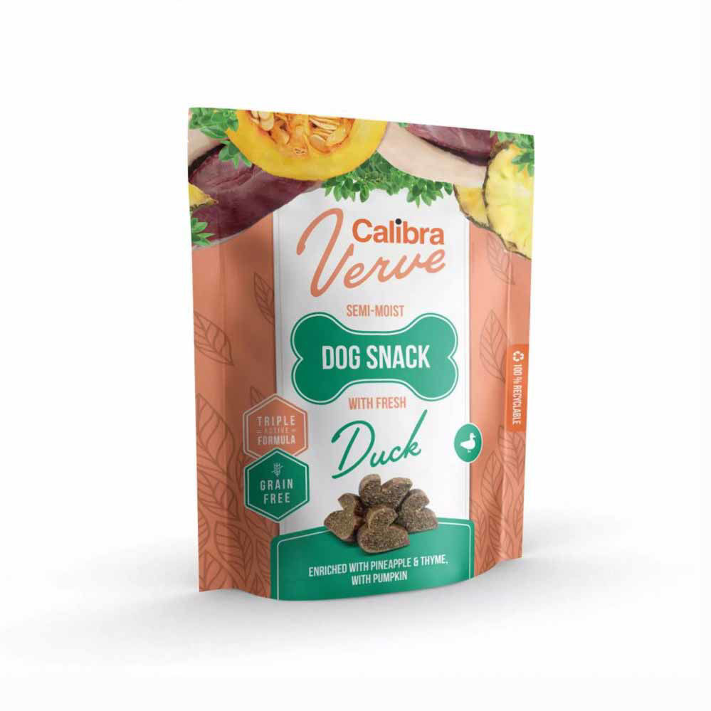 Calibra Verve Snack polmokri priboljški za pse so zasnovani z izjemnim receptom, ki vsebuje svežo raco za visoko okusnost in kakovost. Calibra Verve Snack polmokri priboljški za pse so izdelani brez žitaric in vsebujejo visoko vsebnost beljakovin, vitaminov in mineralov. Prav tako do edinstvena kombinacija sestavin, katerim je dodana edinstvena kombinacija funkcionalnih dodatkov - Triple Active Formula s posušenim ananasom, posušenim timijanom in bučo, ki blagodejno vpliva na zdravje vašega pasjega prijatelja. Izbirajte med raco, slanikom ali piščancem za pravo pasje rajanje!