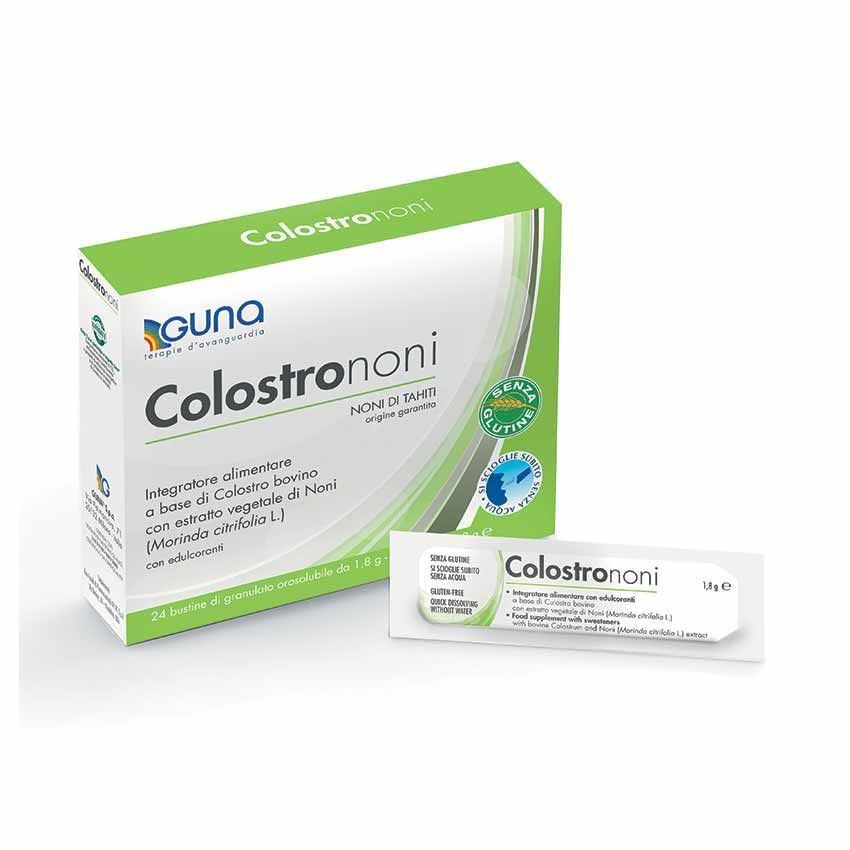 prehransko dopolnilo Colostrononi vsebuje protitelesa (imunoglobulini IgA, IgG, IgM), beljakovine (zlasti laktoferin) in peptide. Z dodajanjem tovrstnega dopolnila podpiramo delovanje koristnih bakterijskih sevov, ki kolonizirajo črevesni trakt.