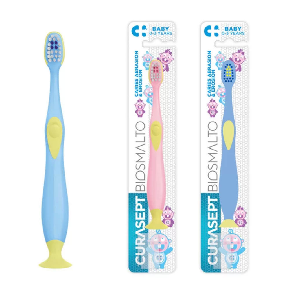 Curasept Biosmalto otroška zobna ščetka je primerna za otroke do 3 leta in je na voljo v privlačnih barvnih kombinacijah.
