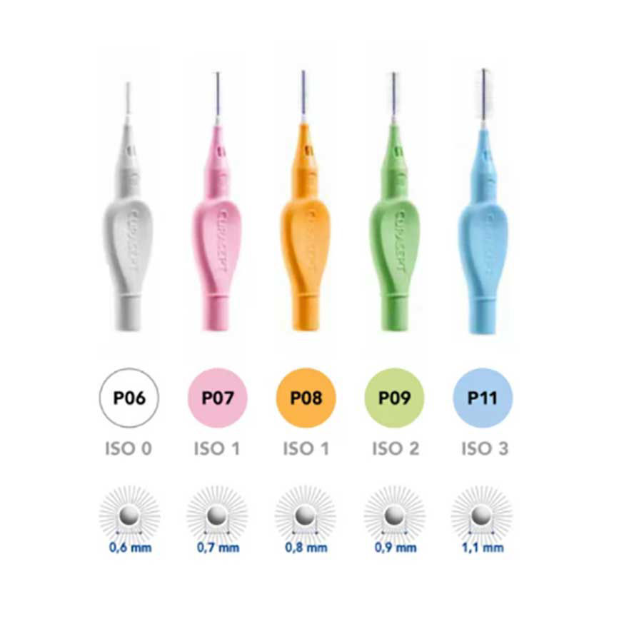 Posamezna velikost medzobnih ščetk je opredeljena s standardom ISO glede na velikosti medzobnih prostorov. Obseg ščetin pa je določen glede na premer ščetin posamezne ščetke. S pomočjo funkcije Safe Stop vam medzobne ščetke Curasept omogočajo edinstveno zaščito med ročajem ter ščetinami. Hkrati je onemogočeno, da pride do poškodbe dlesni, saj je zagotovljena tudi dobra stabilnost žičnega jedra. Ročaj je oblikovan tako, da imate med uporabo popoln nadzor nad medzobno ščetko.