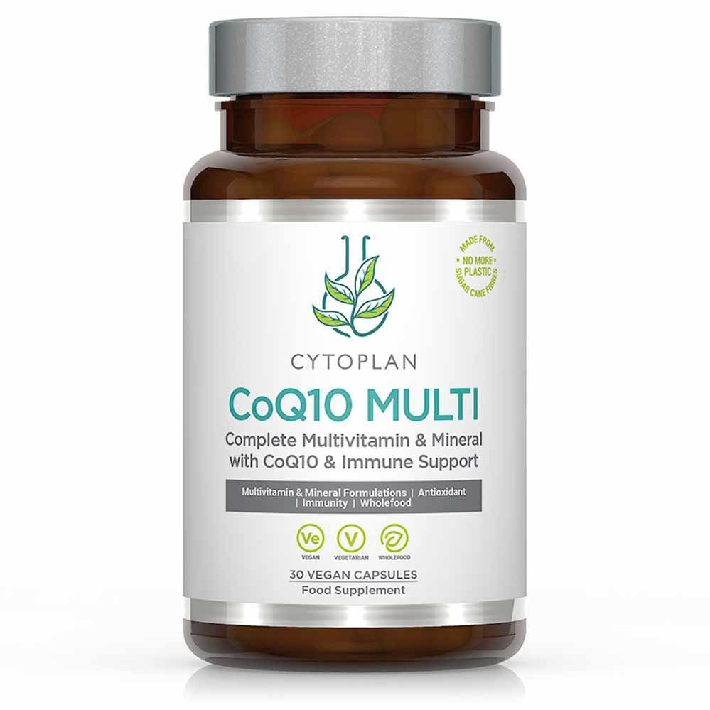 Cytoplan multivitamin + Q10 - za imunski sistem je najobsežnejša multivitaminska in mineralna formula, ki vključuje koencim Q10, beta glukan in odlične vsestranske ravni vitaminov in mineralov. Cytoplan multivitamin + Q10 - za imunski sistem je formula z nizko vsebnostjo železa, ki je tako idealna za moške in ženske po menopavzi, vendar pa jo lahko jemljejo tudi mlajše ženske, ki iščejo multisteroide, ki vsebujejo CoQ10 in višje ravni vitamina B12. Prehransko dopolnilo je ustvarjeno brez GSO, pšenice, glutena, soje, mlečnih izdelkov, dodanega sladkorja, barvil in arom.