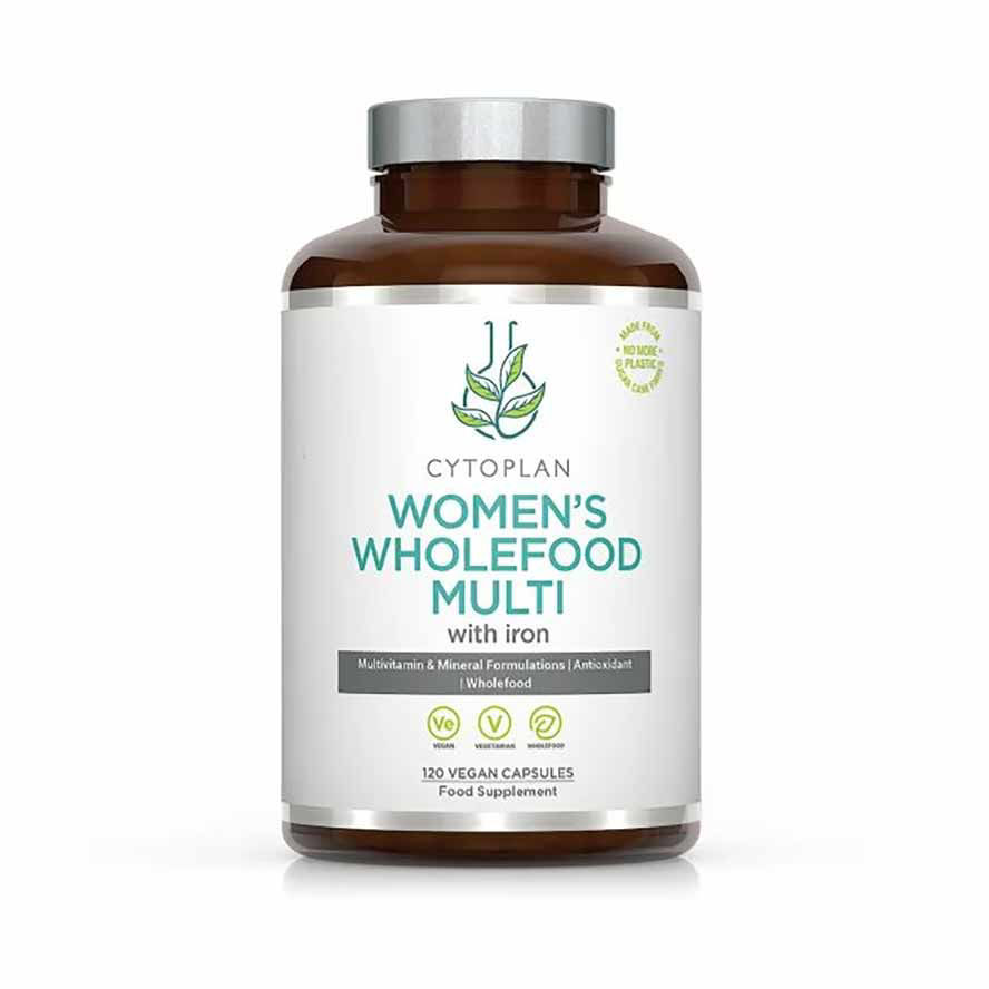 Cytoplan ženski polnovredni multivitamin z železom je obsežen multivitaminski in mineralni dodatek iz polnovrednih ter naravnih botaničnih virov, ki vsebuje 5 mg železa na kapsulo, poleg obsežne palete vitaminov in mineralov. Idealno za najstnike, ženske z menstruacijo ali tiste z nizko vsebnostjo železa. Cytoplan ženski polnovredni multivitamin z železom ne vsebuje GSO, pšenice, glutena, soje, mlečnih izdelkov, dodanega sladkorja, barvil in arom in je primeren za tiste s preobčutljivostjo za kandido in kvasovke.