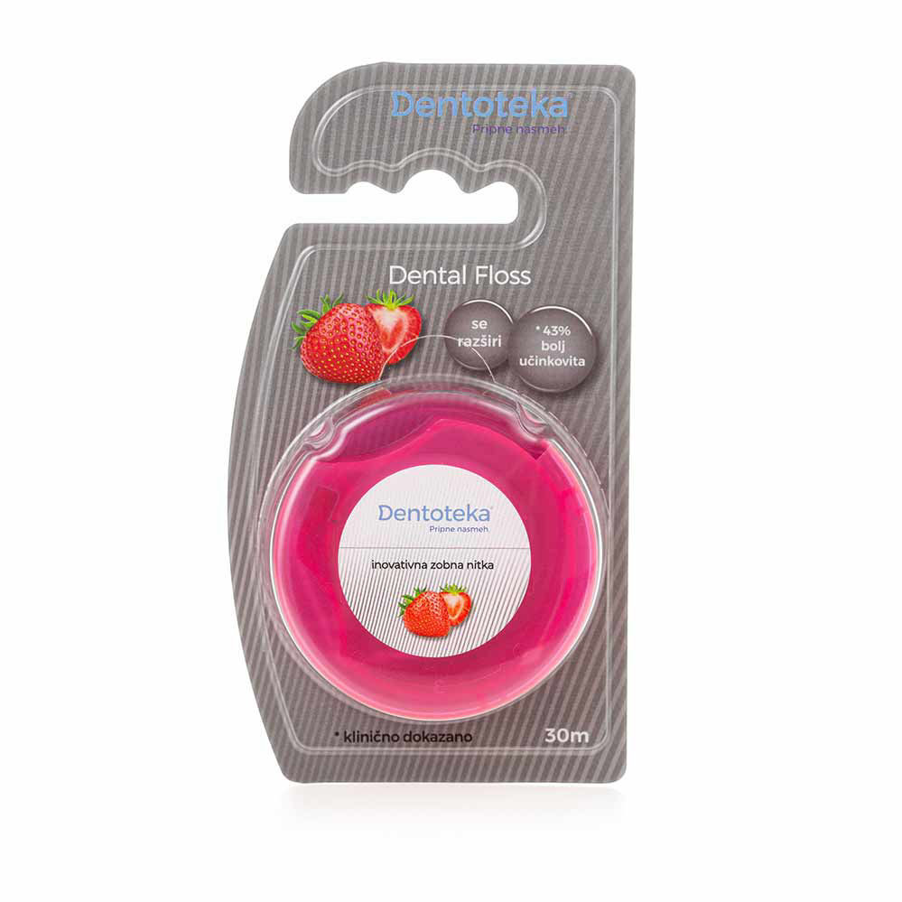Dentoteka zobna nitka učinkovito odstranjuje obloge tam, kjer jih zobna ščetka ne doseže – med zobmi. Dentoteka zobna nitka - okus jagoda je ploščate oblike in prožna, tako da z lahkoto zdrsi med tesne medzobne prostore, hkrati pa je močna in se ne cefra. Dentoteka zobna nitka - okus jagoda poskrbi, da se bakterije težje nabirajo v medzobnem prostoru. Pravilna ter redna zobna higiena je ključnega pomena za vzdrževanje ustnega in splošnega zdravja in hkrati prispeva k lepim ter zdravim zobem in svežemu zadahu.