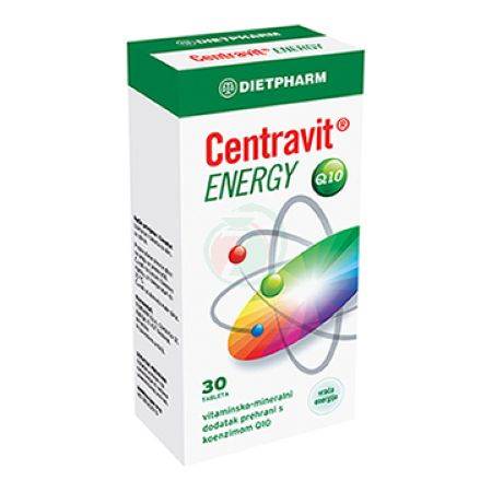 Centravit ENERGY tablete vsebujejo edinstveno multivitaminsko formulo, s 23 vitamini, minerali (oligoelementi) in je obogatena s koencimom 10. Vsebuje skupek vitaminov, ki jih naše telo nujno potrebuje za optimalno delovanje. Centravit Energy priporočamo za izboljšanje splošnega počutja in vsem tistim, ki bi želeli narediti korak več in zaščititi svoje zdravje.