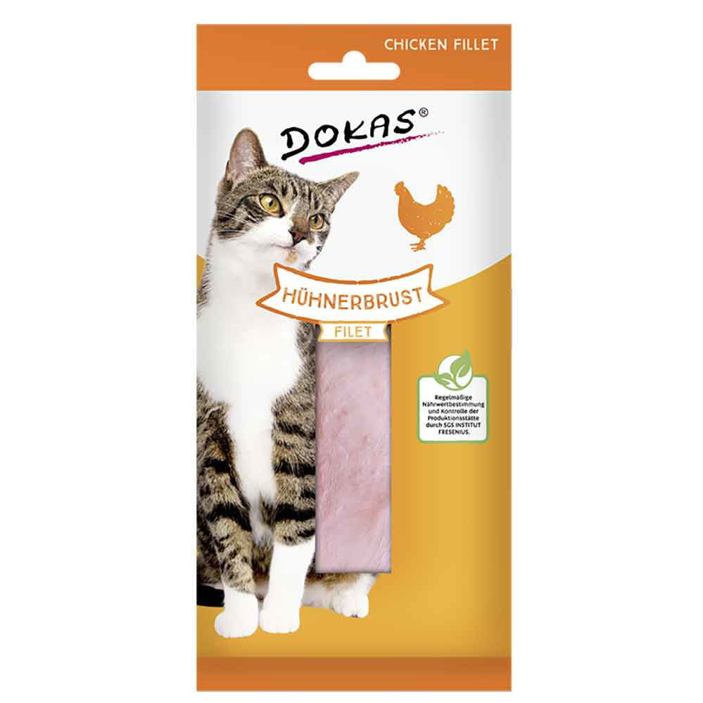 Dokas prigrizek za mačke piščančja prsa file je okusna nagrada za vašega mačka. Izdelano zgolj iz fileja piščančjih prsi. Povsem naravno in primerno tudi za občutljive mačke.