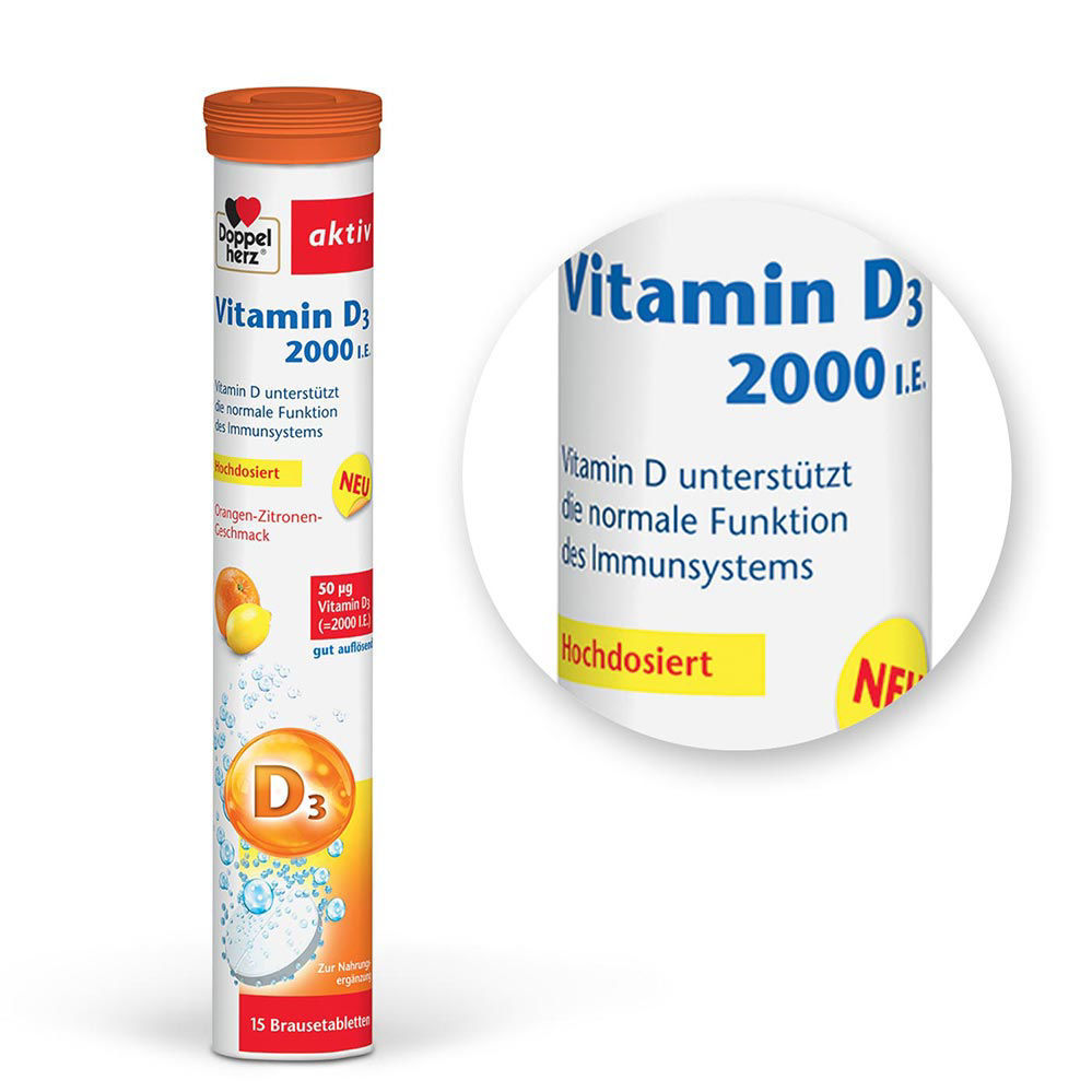 Doppelherz Aktiv Vitamin D3 2000 I.E. je prehransko dopolnilo v obliki šumečih tablet, ki imajo prijeten okus in ustrezno vsebnost nujno potrebnega vitamina D.