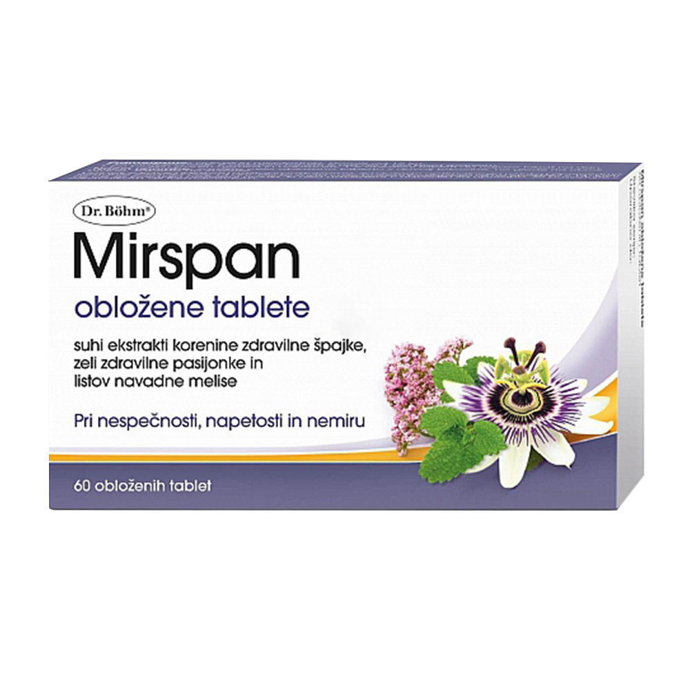Dr. Böhm Mirspan tablete so tradicionalen rastlinski pripravek naravnega izvora, ki vsebuje kombinacijo učinkovin treh zdravilnih rastlin: suhega ekstrakta korenine zdravilne špajke, suhega ekstrakta zeli zdravilne pasijonke in suhega ekstrakta listov navadne melise. Znano je, da korenina zdravilne špajke, zel zdravilne pasijonke in listi navadne melise delujejo pomirjevalno in se uporabljajo kot pomoč pri spanju. Prehransko dopolnilo Dr. Böhm Mirspan poskrbi za lažje uspavanje in se lahko jemlje v obdobjih blagih stanj nemira in napetosti.