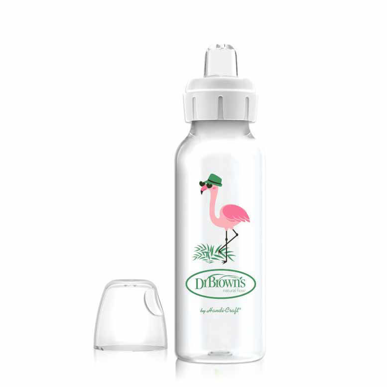 Dr. Brown's PP Flamingo ozkovratna steklenička je primerna za prehod na druge tekočine in učenje pitja. Zaradi edinstvenega notranjega prezračevalnega sistema je klinično dokazano, da zmanjšuje pojav kolik, obenem pa zmanjšuje polivanje, spahovanje in vetrove, saj s hranjenjem po Dr. Brown's steklenički dojenčki pogoltnejo manj zraka. Obsežna raziskava z 884 dojenčki je pokazala, da Dr. Brown's PP širokovratno stekleničko sprejme kar 93 % dojenčkov. Primerno za otroke starosti 6m+.