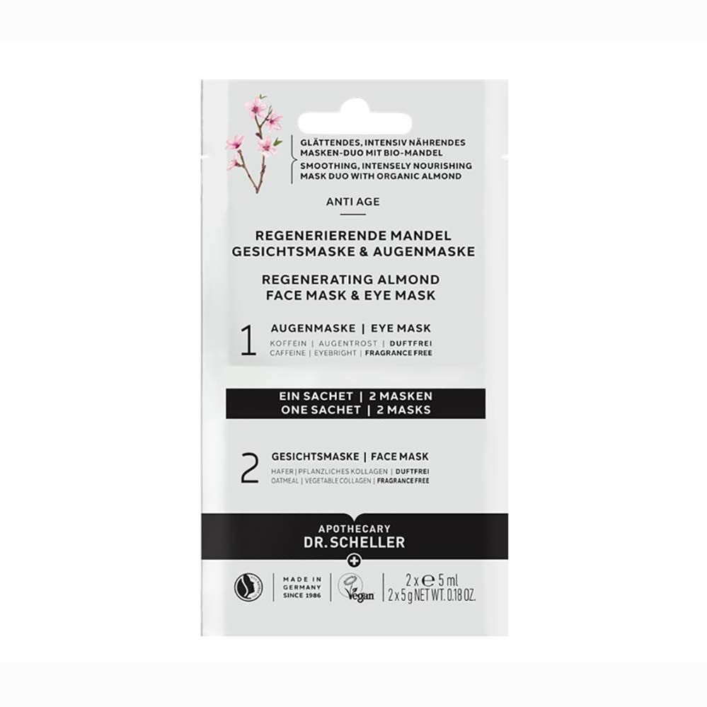 Duo hranilnih mask Dr. Scheller je sestavljen iz maske za obraz in revitalizacijske maske za oči. Vsebuje izjemno nežno organsko mandljevo olje, stimulirajoči kofein ter pomirjujoča izvlečka očesca in ognjiča, ki zagotavljajo nežno nego in izjemen učinek proti staranju. Drobne linije in gube so zmanjšane, medtem ko je koža na otip in videz bolj gladka in prožna. Dr. Scheller regenerativna maska za obraz in oči z mandljem in rastlinskim kolagenom je ustvarjena brez alkohola, dišav, silikonov, mineralnih olj, parabenov in mikroplastike.