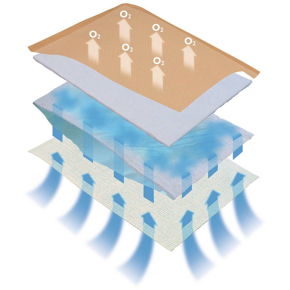 Ta plast vsrka izloček iz dna rane in ga prenese v plast, ki zadržuje vlago. Ta plast vpije izloček in ga odstrani iz dna rane ter tako prepreči maceracijo ob robu rane. Z optimizirano stopnjo vpijanja se zagotovi učinkovito odstranjevanje izločka iz rane, ne da bi se preveč izsušilo dno rane ali povzročala bolečina.
