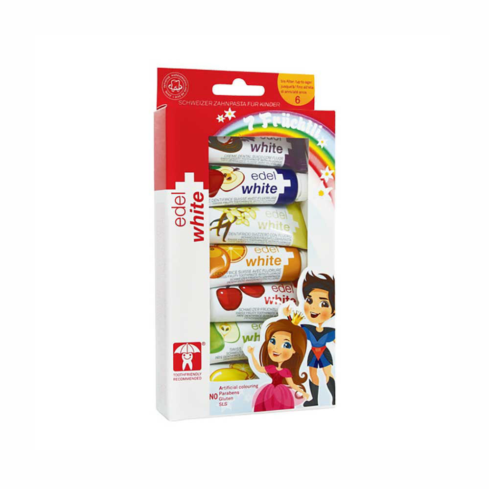 Da bo otrokom umivanje zob postalo v veselje, vam predstavljamo Edel+White 7 Früchtli zobno pasto za otroke. Gre za pakiranje sedmih zobnih past v sedmih različnih okusih. Vaš otrok bo začel oboževati umivanje zob, saj bo lahko izbral okus, ki mu bo z nežno peno napolnil usta ob vsakem umivanju. V pakiranju je torej sedem okusnih zobnih past: jabolko, češnja, limona, sladki koren, pomaranča, hruška, vanilja. Sedaj ni več razloga, da bi otrok zavračal tako okusno umivanje zob.