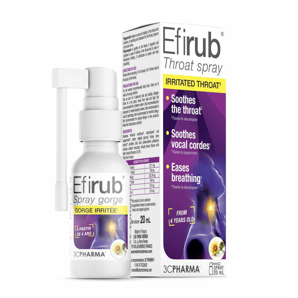 Nelagodje v grlu je zelo pogosto pri odraslih in otrocih, saj povzroča mravljinčenje, neprijetne občutke v grlu in ustni votlini ter je pogosto povezano s težavami pri požiranju ali govorjenju. Efirub pršilo za grlo je sestavljeno iz 4 izbranih rastlin in glicerola, za mehčanje in pomiritev grla in glasilk. Efirub je blagovna znamka, ki ponuja različne izdelke za podporo pri prehladu in gripi. Pršilo se nanese neposredno v ustno votlino s pomočjo razpršilnika, kar omogoča enostavno in ciljno usmerjeno uporabo.