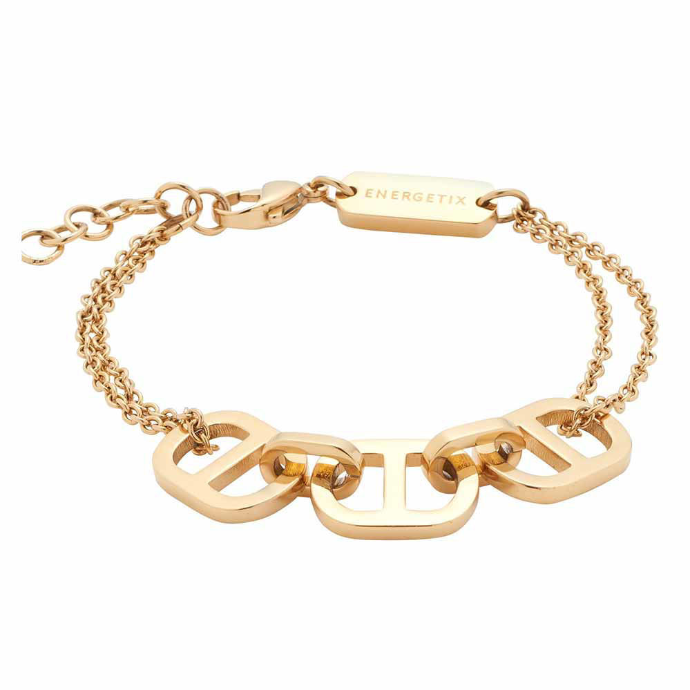 Energetix magnetna zapestnica s povezanimi elementi v zlati barvi nosi tri osupljive detajle, ki so bili na tej pozlačeni verigici združeni v osupljiv osrednji element, ki ga ne krasi le vzorec, podoben diagramu, ampak ga uokvirja tudi fina dvovrstna verigica. Igriva nežnost in vpadljiv videz spretno nasprotujeta drug drugemu. Za prilagoditev dolžine zapestnice preprosto uporabite majhno zaponko na zaskočni kavelj. Energetix magnetna zapestnica s povezanimi elementi v zlati barvi nosi kar dva neodim magneta z močjo 0,12 Tesla ali 1200 Gauss.