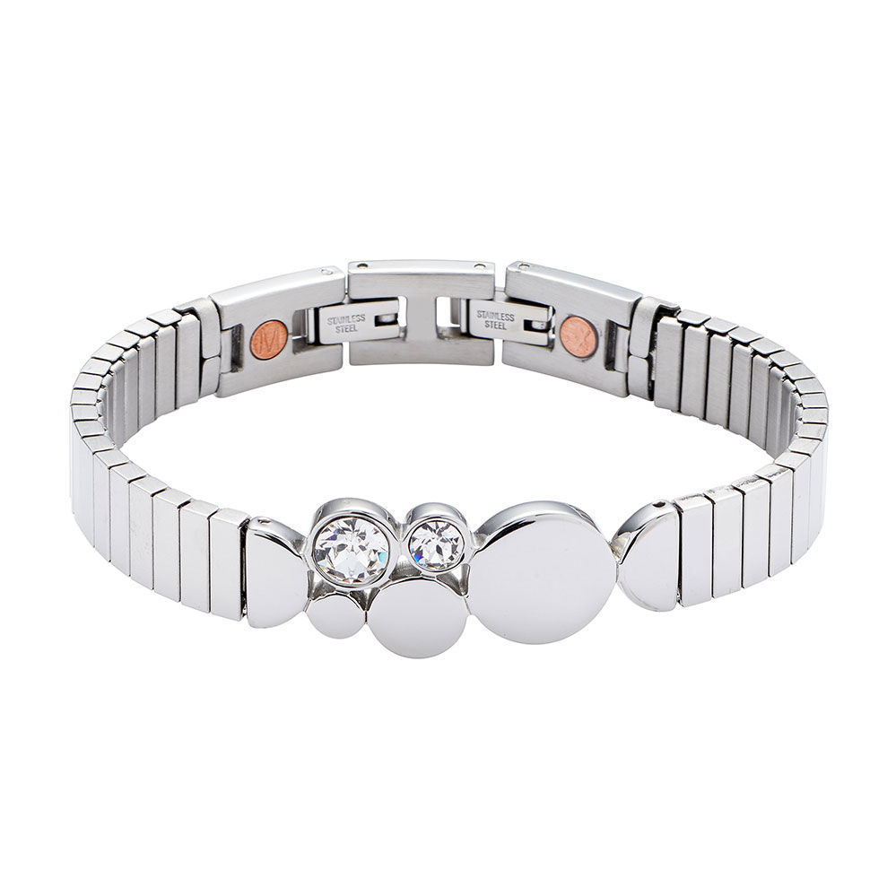 Ukrivljeni osrednji element, ki je bil ustvarjen s krogi različnih velikosti, predstavlja vrhunec te zapestnice. Lesketanje dveh velikih kristalov pritegne poglede, medtem ko polirani zaključek ustvarja prefinjen čar tega kosa. Nosilci imajo koristi od visoke stopnje udobja pri nošenju, saj je zapestnica prilagodljiva in se zlahka prilega zapestju.