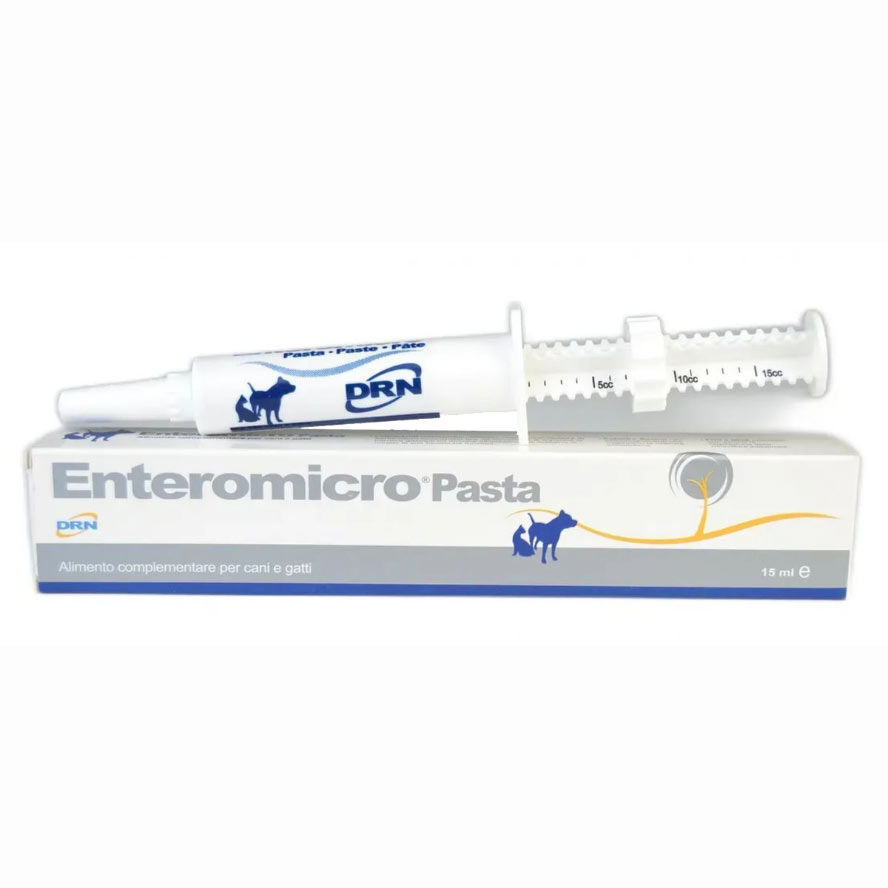 Enteromicro Complex dopolnilna pasta za pse in mačke je prehransko dopolnilo, namenjeno podpori črevesne mikroflore in prebavnega sistema. Uporablja se pri motnjah črevesne flore, ki nastanejo zaradi zdravil, stresa, sprememb v prehrani ali drugih dejavnikov. Pasta pomaga uravnavati prebavo, izboljšuje presnovo in podpira imunski sistem. Uporaba za mačke je prilagojena količini telesne teže in priporočena doza je običajno manjša kot pri psih. Zaradi praktične oblike paste je enostavna za dajanje, še posebej pri živalih, ki težje sprejemajo tablete.