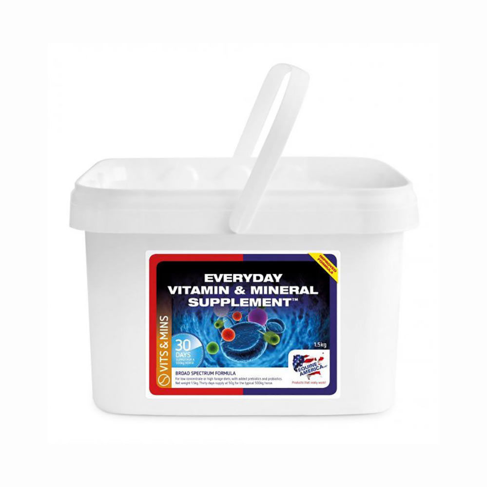 Potrebe po vitaminih in mineralih so pri konjih velike in jih z običajno hrano težko popolnoma zadovoljimo. Vnos vseh potrebnih hranil je zahteven predvsem zato, ker konji potrebujejo različne vitamine in minerale, zato je preprost način za zagotovljen vnos ključnih vitaminov dodatek Equine America Everyday za konje z vitamini in minerali.