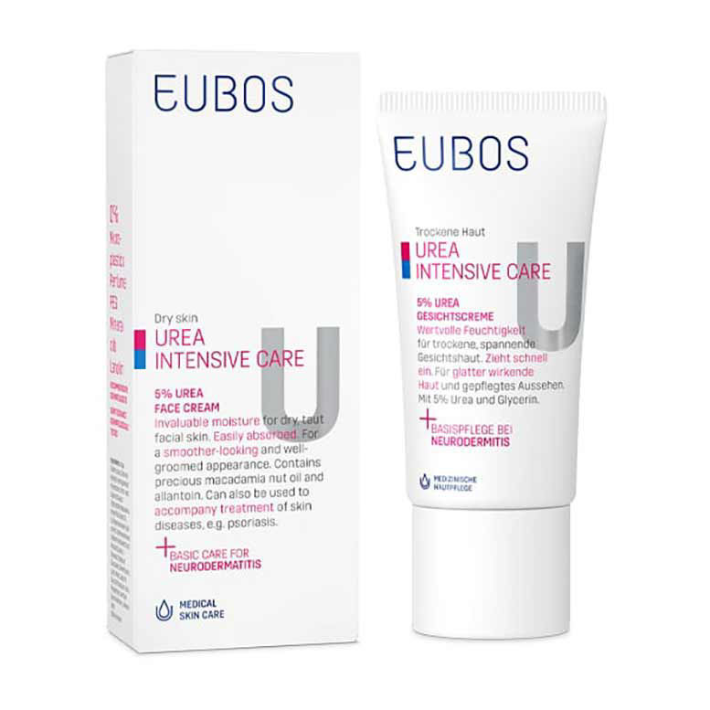 Eubos 5% Urea krema za obraz je izjemno lahka krema, ki se hitro vpija in je primerna za vsakodnevno uporabo na predvsem grobi suhi in izčrpani koži. Primerna je tudi pri posebnih stanjih kože, ki so posledice sledečih bolezenskih stanj: ekcem, luskavica, sladkorna bolezen.