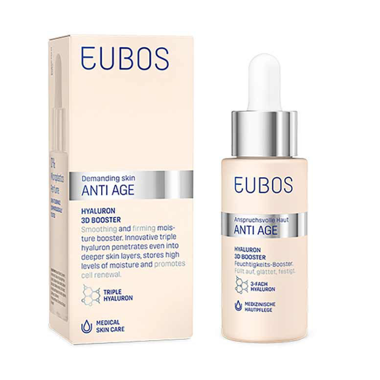 Eubos Anti-Age Hyaluron 3D Booster koncentrat je lahka koncentrirana kozmetična formula primerna predvsem za zrelo ter tudi občutljivo / suho kožo. Lahka tekstura tekočine se izredno hitro vpije in tako pušča svilnato gladek občutek na koži.