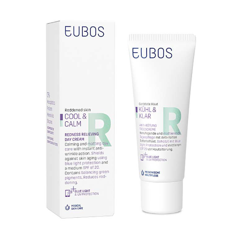 Eubos Cool & Calm dnevna krema ZF20 s pomirjujočimi lastnostmi proti rozacei in staranju je medicinski izdelek, katere glavni aktivni dejavniki so fitoaktivni kompleks, ki zavira dražilne procese, krepi krvne žile in vidno zmanjšuje rdečico. CM naringenin halkon, ščiti in uravnava problematično kožo, zeleni pigmenti ustvarijo občutek bolj poenotene kože in vidno zmanjšajo gube, ektoin pa nudi globinsko vlaženje. Širokspektralna UV zaščita s srednjim zaščitnim indeksom SPF 20, skupaj z zaščito pred modro svetlobo, ščiti občutljivo kožo pred fotostaranjem, ki ga povzroča izpostavljenost naravni ali umetni svetlobi.