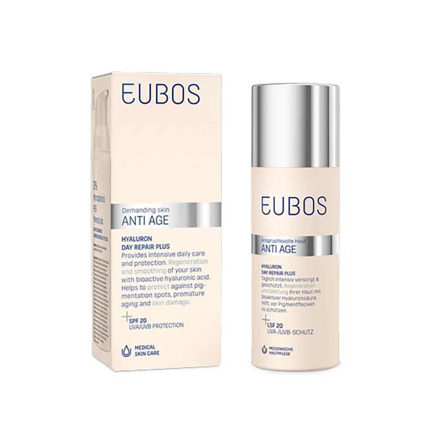 Eubos Anti Age Hyaluron Repair & Protect LSF 20, intenzivna krema z UV zaščito za zmanjševanje gubic ter čvrsto in bolj gladko kožo z UV zaščito. Vsebuje hialuronsko kislino, Q10 in vitamin C. Ohranja svež in mladosten videz.