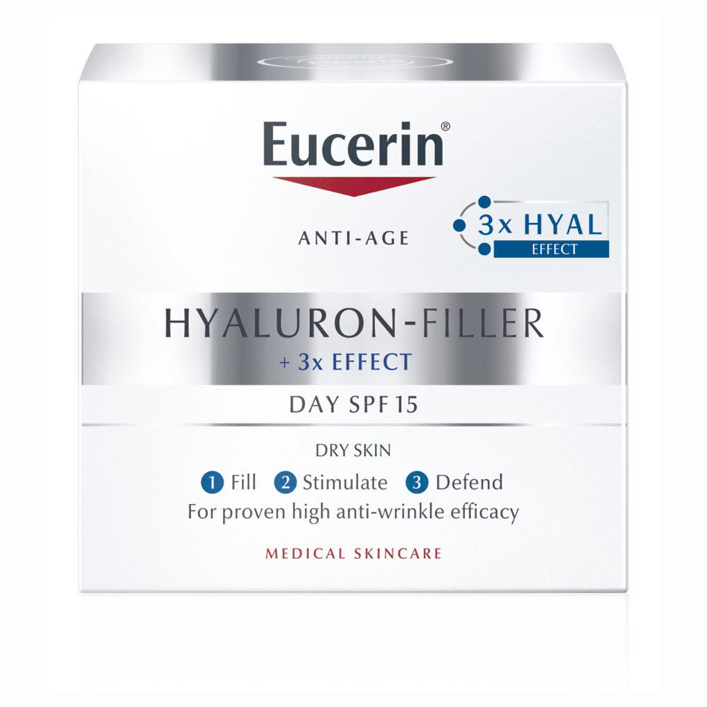 Eucerin Hyaluron-Filler dnevna krema za suho kožo pripravi vašo kožo na vse dnevne izzive in jo dodatno zaščiti pred soncem s faktorjem 15.