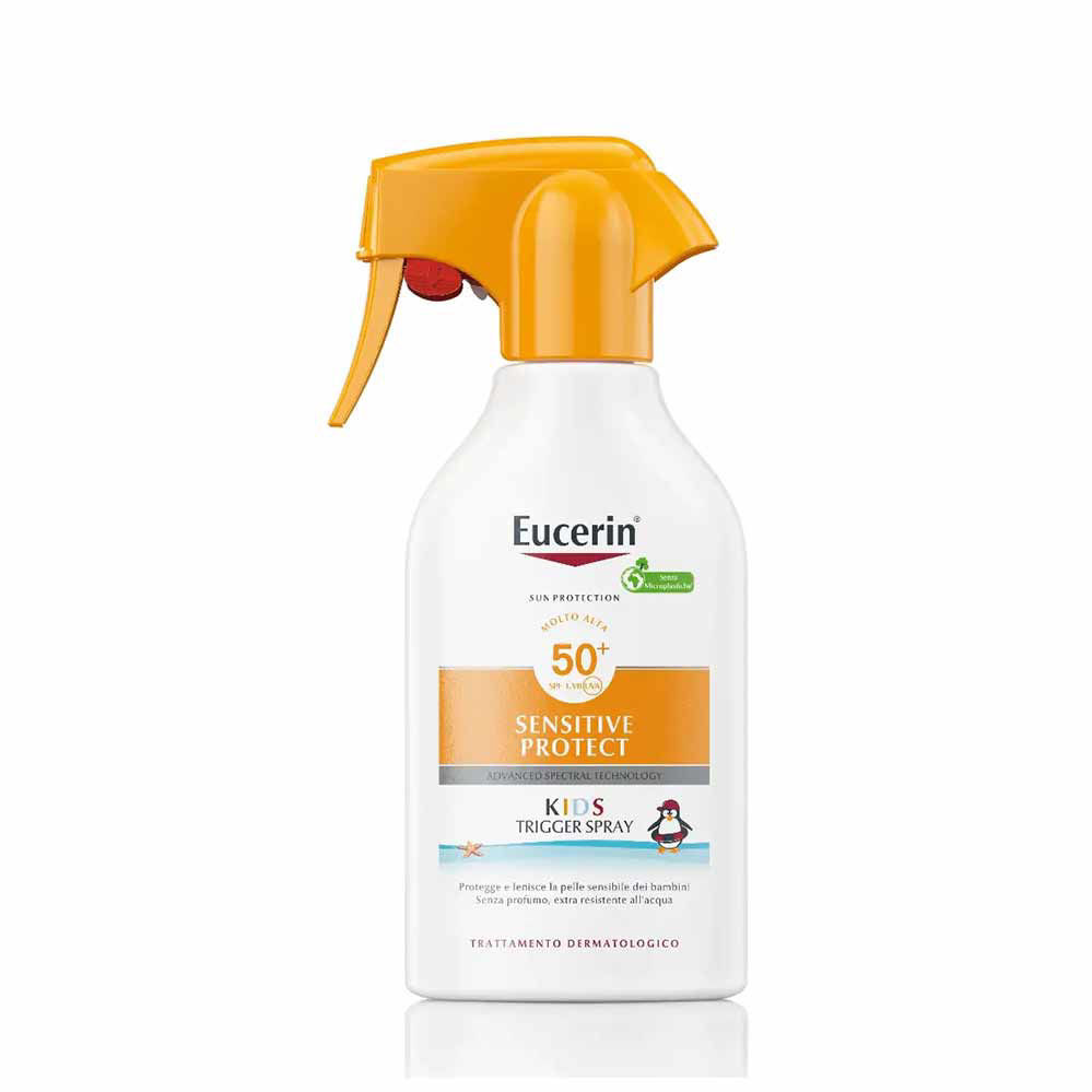 Eucerin Sun Kids Sensitive Protect sprej za zaščito otroške kože pred soncem ZF 50 + je posebej zasnovan za pomiritev občutljive otroške kože in zaščito pred sončnimi opeklinami ter dolgoročnimi poškodbami zaradi sonca. Primeren je tudi za atopijsko kožo, nagnjeno k atopijskemu dermatitisu. Napredna spektralna tehnologija združuje širokopasovne in fotostabilne UVA-/UVB-filtre za zelo visoko UV-zaščito z licochalconom A, ki nevtralizira proste radikale, ki jih povzročata UV- in HEV- svetloba.