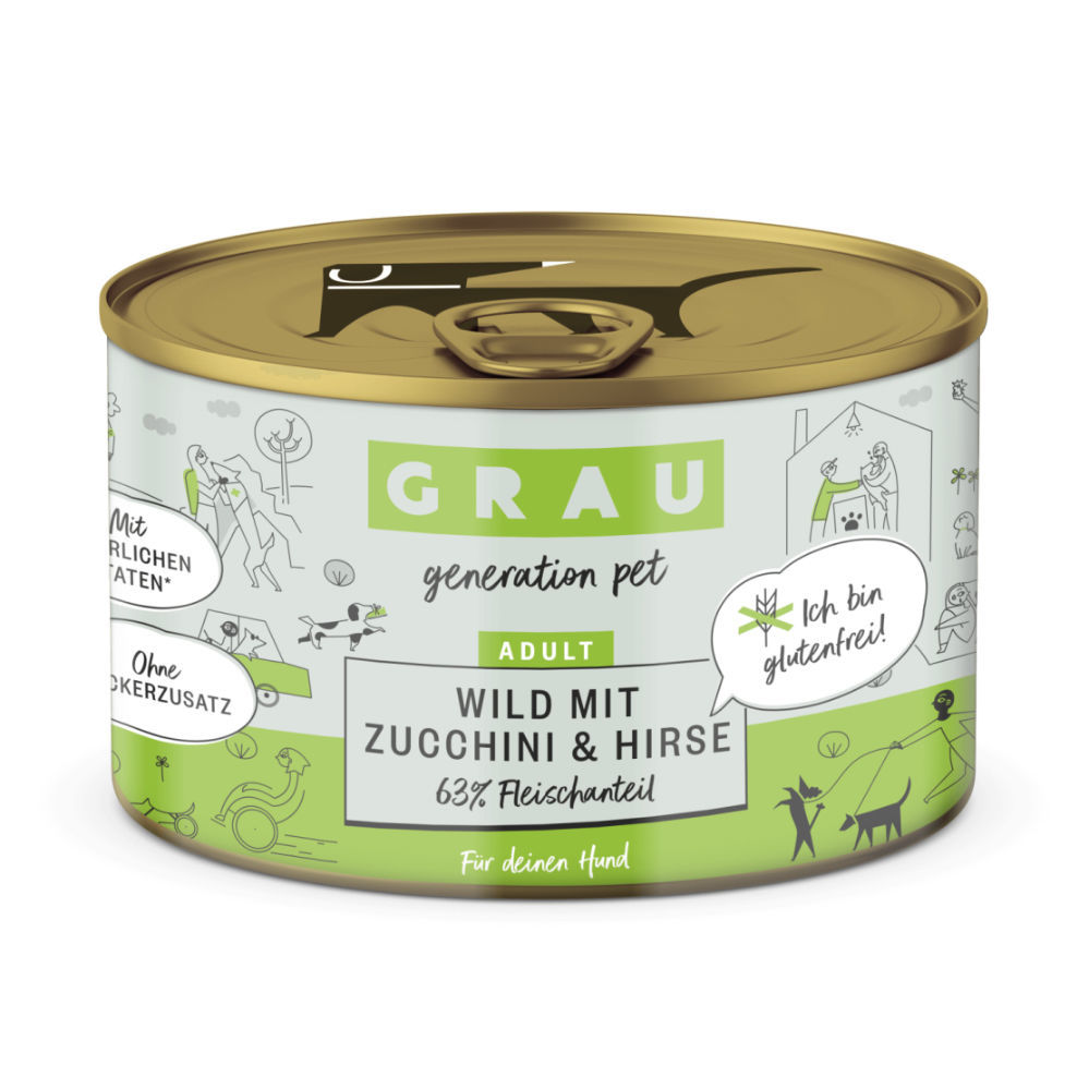 Grau Generation Pet konzerva za pse z divjačino, bučkami in prosom je visoko kakovostna mokra hrana, posebej zasnovana za odrasle pse, tudi tiste z občutljivim prebavnim sistemom. Sestava vsebuje 63 % divjačine, kar zagotavlja bogato in okusno beljakovinsko osnovo, primerna pa je tudi za pse z intoleranco na hrano. Bučke prispevajo k vitaminskemu in mineralnemu ravnovesju ter so znane po visoki vsebnosti vitaminov A, C in B1. Proso, kot brezglutenska sestavina, je vir mineralov, kar dodatno podpira zdravje vašega psa.