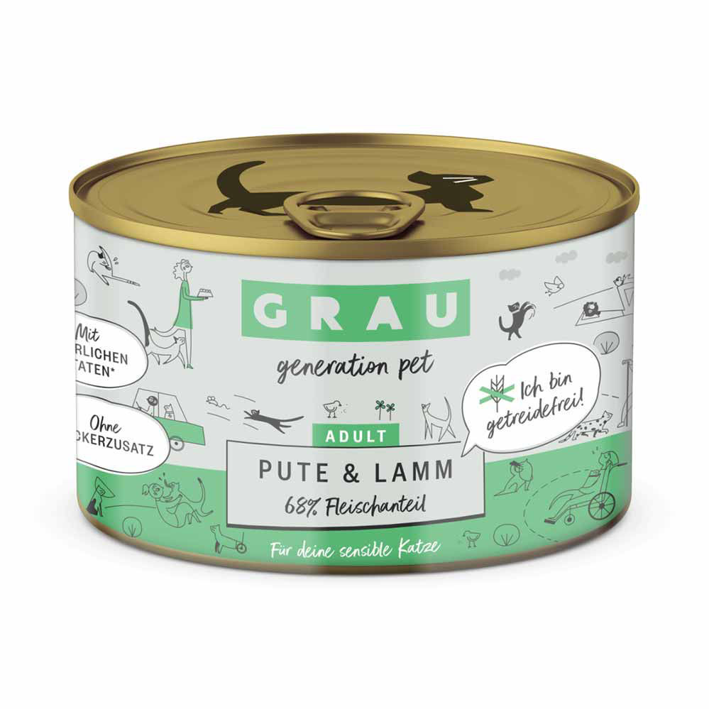 To je mokra hrana, ki je izdelana iz visoko kakovostnih sestavin. Med njimi ima glavno vlogo puranje meso, ki predstavlja minimalno 40% sestave hrane. Dodana je še jagnjetina, ki jo je minimalno 28%. Receptura Grau konzervirane hrane nima dodanih žitaric in umetnih dodatkov. Izdelana je povsem brez ogljikovih hidratov, umetnih barvil in arom.
