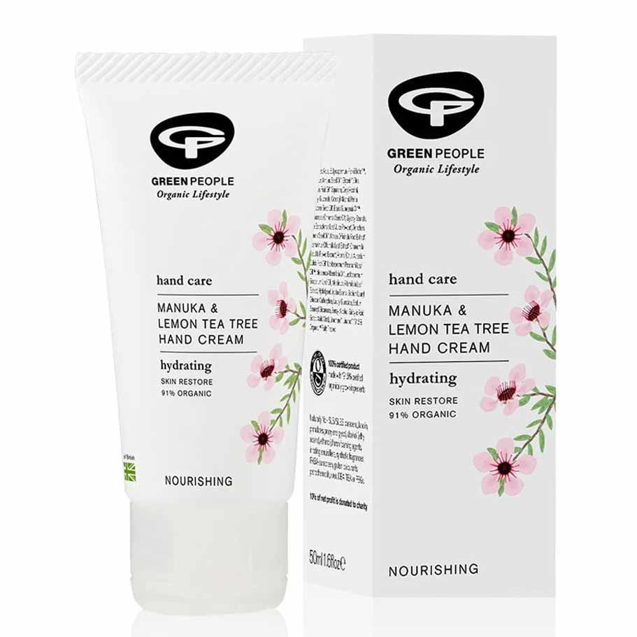Green People krema za roke vsebuje karitejevo maslo, skvalen iz oljk, olje manuke in limoninega čajevca ter sladko pomarančo. Kožo izdatno navlaži, aktivno spodbuja njeno obnovo, krepi njeno vitalnost in jo varuje. Olje limoninega čajevca podpira naravno obnovo suhe in razpokano kožo rok. Čajevec in manuka sta poznana po naravnem čistilnem delovanju. Karitejevo maslo in skvalen iz oljke ohranjata vlago v koži in pripomoreta k hitrejši obnovi suhe ter razpokane kože. s poživljajočim vonjem sladke pomaranče.