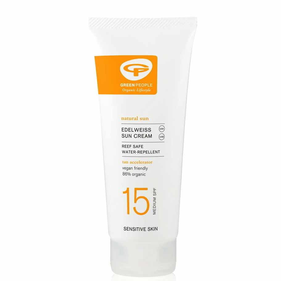 Green People zaščitna krema za hitrejšo porjavitev ZF 15 je obogatena z aloe vero in avokadom ter izvlečki planike, inositola in zelenega čaja. Srednja zaščita proti UVA in UVB žarki z naravnimi sestavinami (titanijev dioksid, naravna cimetova kislina, izvlečki planike) zvišuje raven kolagena, vsebuje antioksidante, ki zmanjšujejo vpliv UV žarkov ter zagotavlja dolgotrajno vlaženje in ten. Aktiven pospeševalec porjavitve (inositol iz rožičevca) daje 25 % več tena. Vsebuje zaščitni jagodni vosek, ki ne maši por.