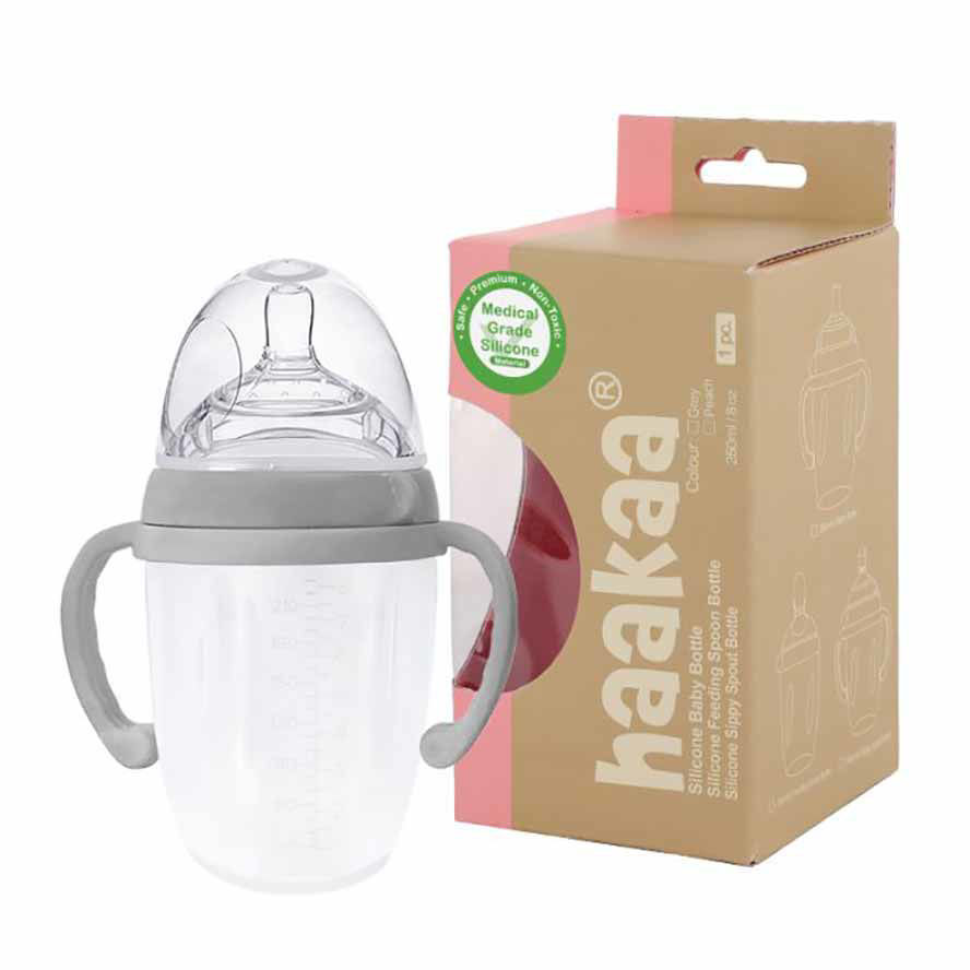 Haakaa silikonske otroške stekleničke 3. generacije so izdelane iz vrhunskega medicinskega silikona. Na voljo je v dveh različnih velikostih 160 in 250 mL. Odlične so za učenje samostojnosti pri vašem malčku. Je povsem enostavna za držanje v majhnih rokah.