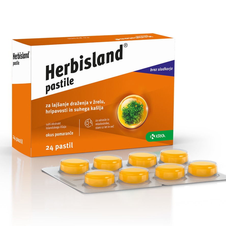 Hripavost, draženje na kašelj in posledično suh kašelj so pogosti simptomi okužb zgornjih dihal, najpogosteje prehlada, gripe in drugih virusnih okužb. Včasih ti simptomi vztrajajo še tedne po okužbi, saj se sluznica ustne votline in grla med okužbo lahko izsuši ali celo poškoduje in potrebuje čas, da se zaceli. Herbisland pastile vsebujejo ekstrakt islandskega lišaja, ki se priporoča za lajšanje draženja sluznice grla in ustne votline ter s tem povezanega suhega kašlja. Brez sladkorja in z okusom pomaranče.