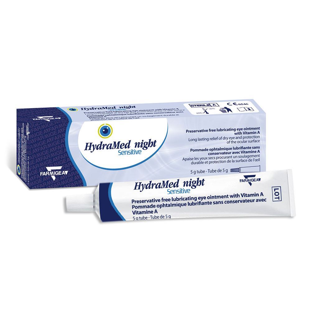 Hydramed Night Sensitive je mazilo, ki ne vsebuje lanolina in je idealno za uporabo ponoči z namenom lajšanja simptomov suhih oči.