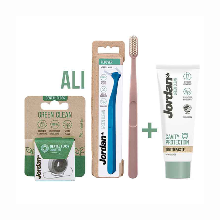 V tem kompletu boste namreč našli tri izdelke, ki skupaj soustvarjajo odlično kombinacijo za čistočo vaših zob. Vsi izdelki so del Jordan linije Green Clean, katere namen je ponuditi izdelke, narejene iz skrbno izbranih recikliranih ter bio materialov. Tako nam je omogočeno, da za ustno higieno poskrbimo na okolju prijazen način.