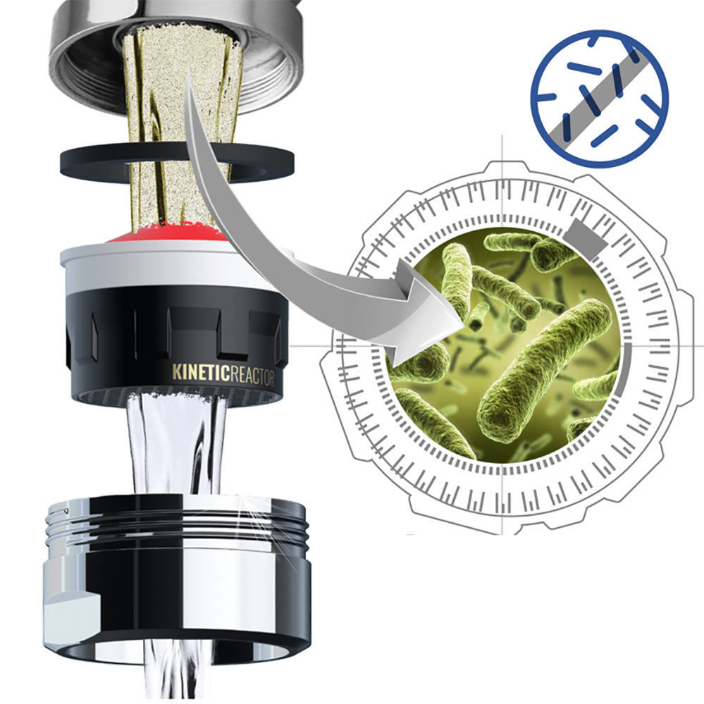 Kinetic Reactor deluje popolnoma brez dodatne električne energije ali kemikalij in kljub temu učinkovito deluje. Kot mrežica na pipi obdeluje vodo, da bo voda iz pipe kvalitetna in čim boljša za vaš organizem. Voda, ki teče skozi Kinetic Reactor nima neprijetnih priokusov in vonjav. Ko boste to vodo uporabljali tudi za grelnike vode ali umivanje posode, boste ugotovili, da se bo zmanjšala uporaba kemikalij.