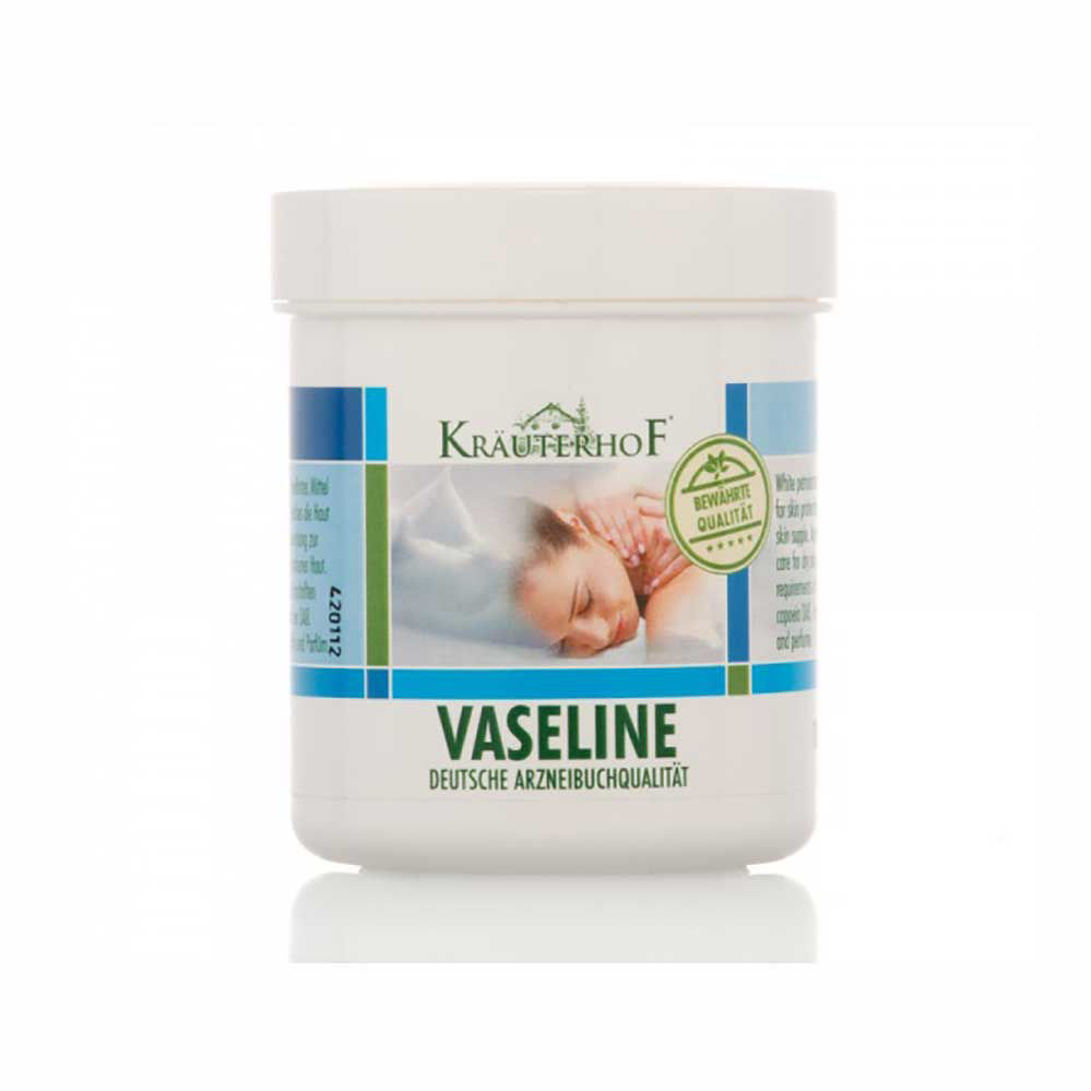 Naravni beli vazelin kot je Krauterhof vazelin izdatno neguje, varuje in mehča kožo. Primeren je za oskrbo razpokanih rok, komolcev, kolen in stopal. Hranljiv izdelek za vašo suho in razpokano kožo, saj bo po nanosu, na koži ostala tanka plast, ki zadržuje vlago in toploto vaše kože. Zaradi svoje sposobnosti zadrževanje vlage in hranljive nege, je vazelin primeren tudi za nego kože po britju ali depilaciji, saj koži preprečuje pretirano dehidracijo in jo ob enem mehča.