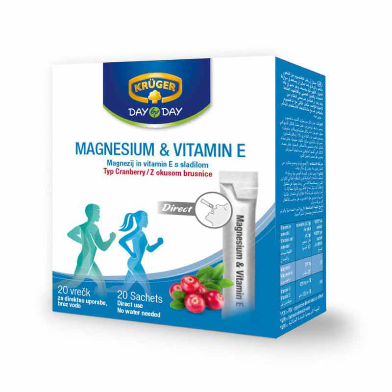 Krüger Magnezij in vitamin E je prehransko dopolnilo v vrečicah. Primerno za vse aktivne in športnike. Vsebuje optimalen odmerek magnezija ter vitamina E. Preprosto za zaužitje.