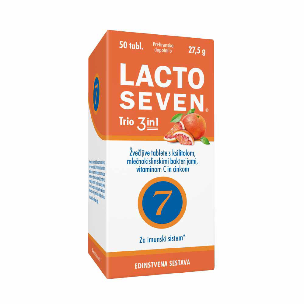 LactoSeven Trio 3in1 so žvečljive tablete z mlečnokislinskimi bakterijami in osvežilnim okusom rdeče pomaranče. Vsestransko uporaben izdelek vsebuje sedem različnih naravnih sevov mlečnokislinskih bakterij (npr. vrste Lactobacillus in Bifidobacterium) ter vitamin C in cink, ki prispevata k normalnemu delovanju imunskega sistema. Žvečljiva tableta je slajena s ksilitolom. Tehnologija Bio-support zagotavlja preživetje bakterij med proizvodnim procesom, skladiščenjem končnega izdelka in pri prehajanju skozi želodčno kislino.